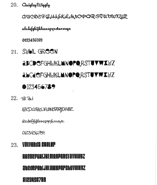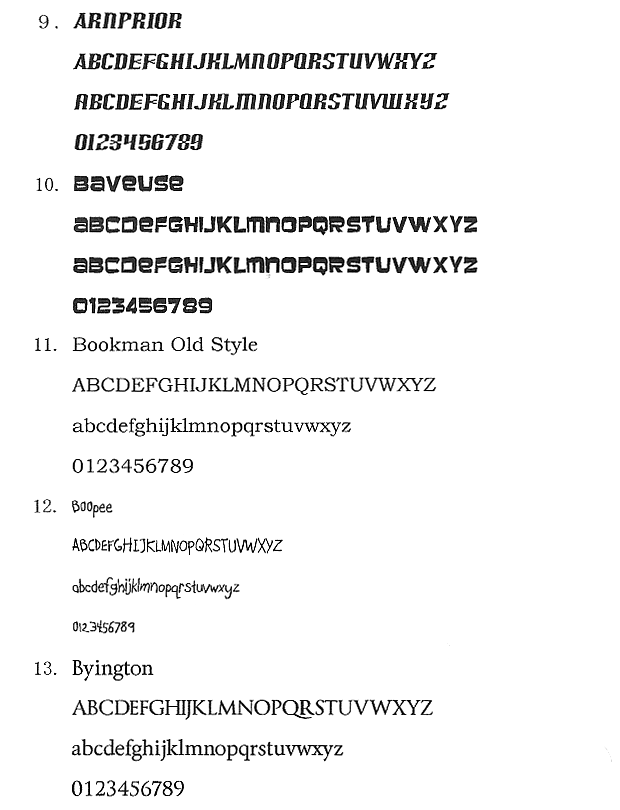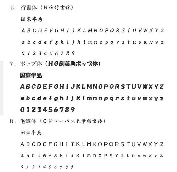 以下がhometown Gにてご用意している基本的な文字見本になります。斜体や太字など出来ますが、商品によっては適さない文字もありますので、御了承ください。